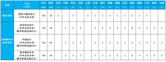 2025年我校計劃招收中外合作辦學(xué)設(shè)計學(xué)類本科生400人,文、理兼收。各招生省份分省計劃詳見下表: