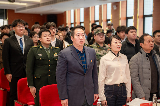 長安區(qū)武裝部副部長付離川,黃良街辦專武干事張俊,西安科技大學(xué)高新學(xué)院黨委書記劉琳,學(xué)院黨委工作部、黨委學(xué)生工作部、馬克思主義學(xué)院、保衛(wèi)與后勤保障處、學(xué)生處、就業(yè)與創(chuàng)業(yè)辦公室負(fù)責(zé)人,各二級(jí)學(xué)院負(fù)責(zé)人、輔導(dǎo)員代表,各學(xué)生組織代表,2025年退役復(fù)學(xué)學(xué)生、退役軍人志愿服務(wù)隊(duì)全體隊(duì)員及意向應(yīng)征學(xué)生代表齊聚現(xiàn)場,共同參與本次大會(huì)。大會(huì)在莊嚴(yán)的國歌聲中正式拉開帷幕。