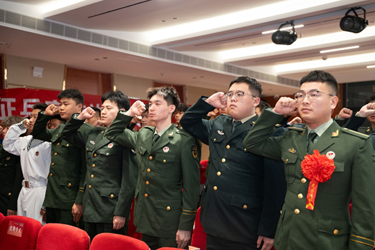 張子涵代表新一屆退役軍人志愿服務(wù)隊(duì)發(fā)言,他感謝領(lǐng)導(dǎo)、老師和同學(xué)們的信任與支持,表示將傳承“退伍不褪色,奉獻(xiàn)新時(shí)代”的精神與全體隊(duì)員一道傳承軍人本色,聚焦服務(wù)實(shí)效,凝聚團(tuán)隊(duì)力量,擦亮團(tuán)隊(duì)品牌,以忠誠堅(jiān)守與熱忱擔(dān)當(dāng),為學(xué)院和社會(huì)貢獻(xiàn)青春力量,不負(fù)重托帶領(lǐng)退役軍人服務(wù)隊(duì)邁上新臺(tái)階。發(fā)言最后,他帶領(lǐng)全體退役軍人重溫入伍誓詞,“若有戰(zhàn),召必回”的鏗鏘誓言響徹會(huì)場。
