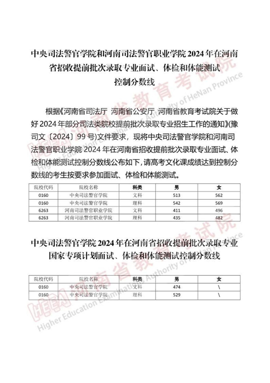 | 中央司法警官學院和河南司法警官職業(yè)學院2024年在河南省招收提前批次錄取專業(yè)面試、體檢和體能測試控制分數(shù)線 |