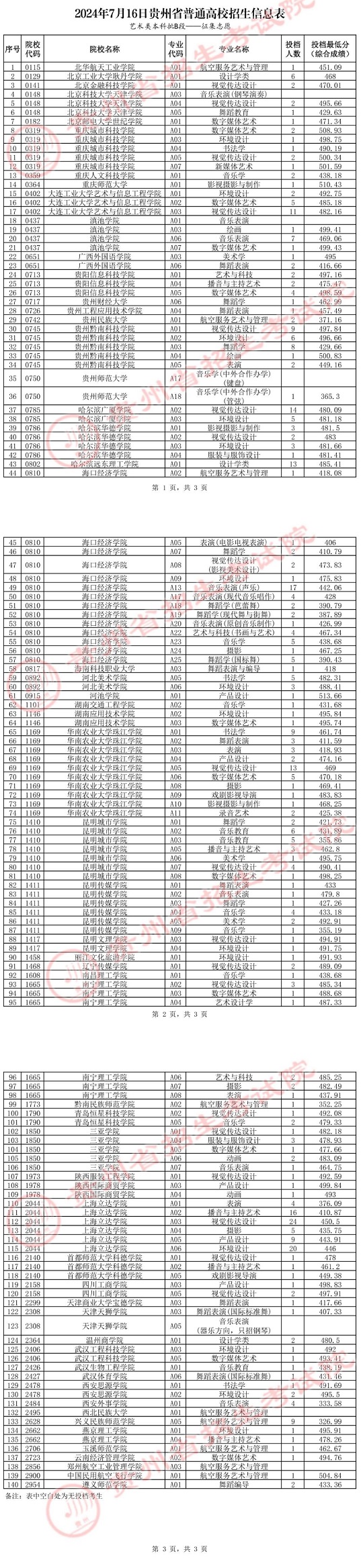 2024年7月16日貴州省普通高校招生信息表(藝術(shù)類本科批B段—征集志愿)