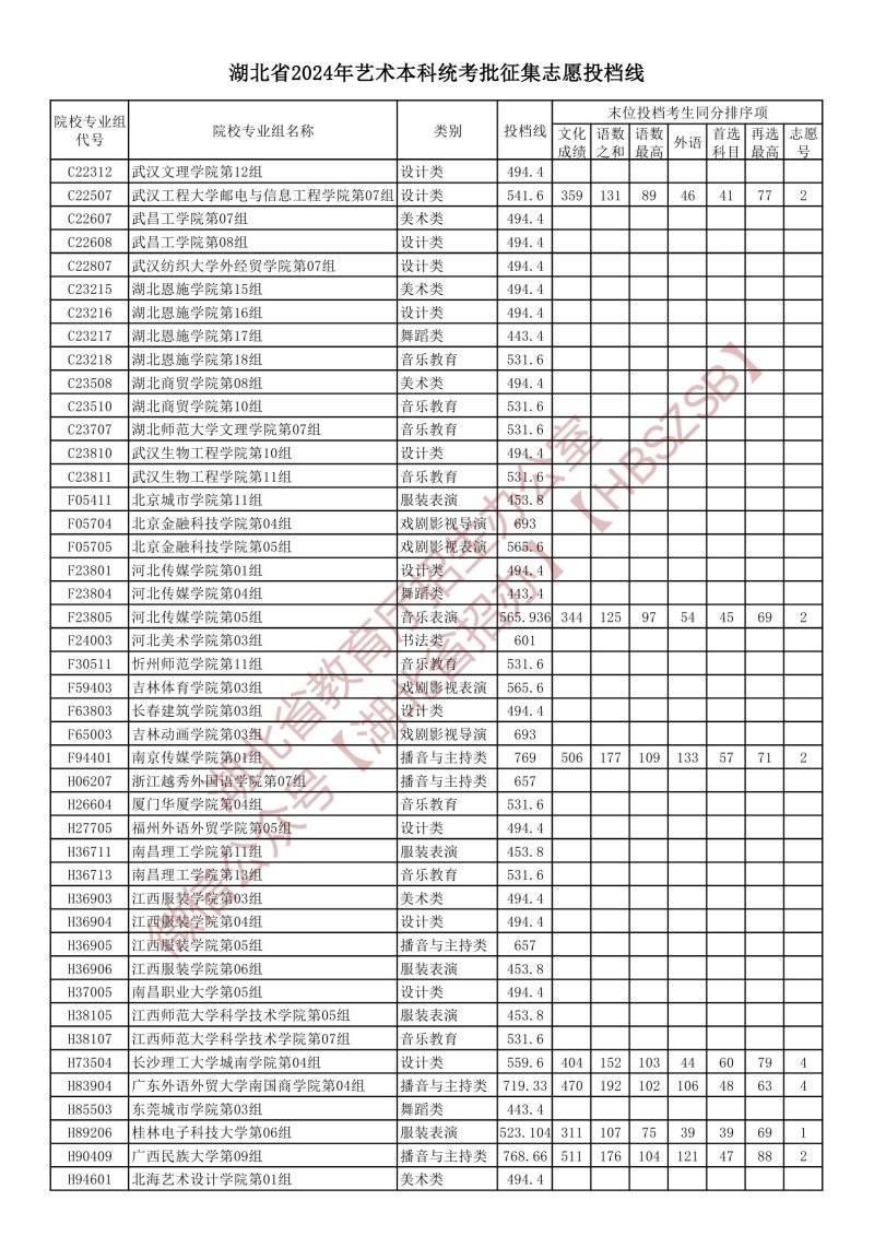 湖北省2024年藝術(shù)本科統(tǒng)考批征集志愿投檔線
