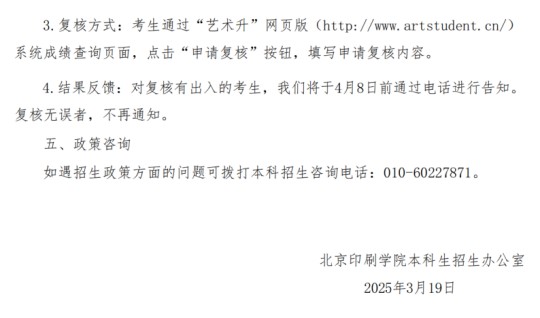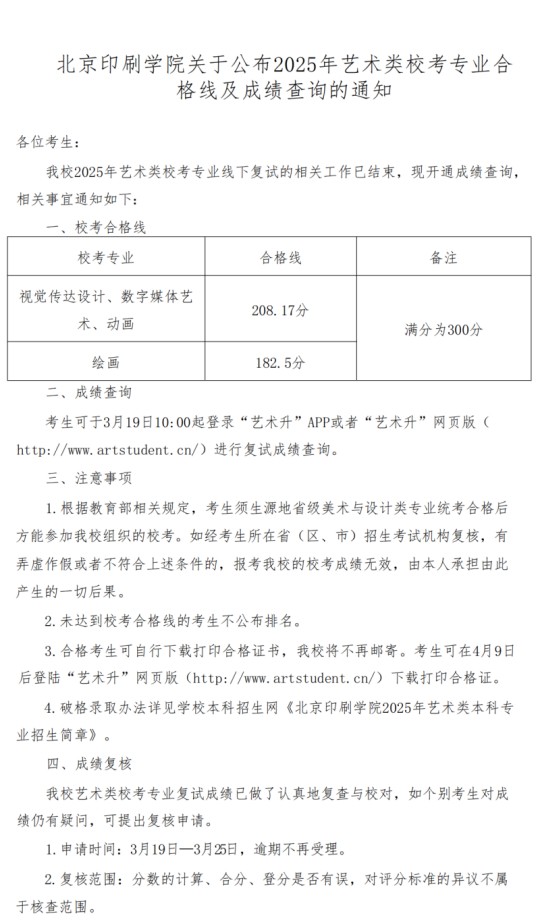 北京印刷學(xué)院關(guān)于公布2025年藝術(shù)類?紝I(yè)合格線及成績查詢的通知