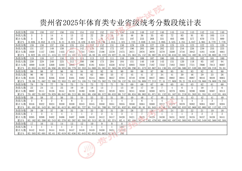 根據(jù)《省教育廳關(guān)于做好貴州省2025年普通高等學(xué)校藝術(shù)、體育類專業(yè)考試招生工作的通知》(黔教發(fā)〔2024〕30號)精神,貴州省2025年普通高校招生體育類專業(yè)省級統(tǒng)考錄取控制分?jǐn)?shù)線已劃定。