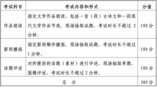 (5)考試:每位考生在一個(gè)面試考室一次性完成考試,包括作品朗讀、新聞播報(bào)、話題評(píng)述三個(gè)科目。三個(gè)科目均為現(xiàn)場(chǎng)抽取試題。