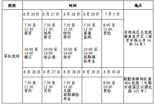 (二)6月26日至29日,考生持本人身份證、高考準考證、高考成績單、面試表、病史調(diào)查表、2張1寸近期彩色免冠照片[面試表、病史調(diào)查表可提前至當?shù)乜h(市、區(qū))人武部領(lǐng)取,或關(guān)注“江蘇征兵”微信公眾號下載打印],根據(jù)體檢地區(qū)劃分和時間安排(詳見下表)分別自行到指定地點參加面試、體格檢查及心理檢測。無錫片區(qū)、南京片區(qū)分別于6月30日、7月1日組織不合格(可復(fù)檢)考生進行復(fù)檢,復(fù)檢結(jié)果為最終結(jié)論。