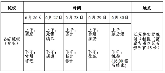 考生須于6月27日至28日(8:00至11:30、14:00至17:30)持本人身份證、高考準考證、高考成績單、1寸正面免冠照片2張,到江蘇司法警官職業(yè)學(xué)院(地址:南京市浦口區(qū)百合路248號)參加面試、體檢、體能測試。