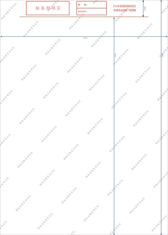 書法評卷采取計(jì)算機(jī)輔助評卷方式,要保持條形碼及條形碼粘貼區(qū)域(紅線以上區(qū)域,下同)清潔,嚴(yán)禁在條形碼上或條形碼粘貼區(qū)域涂抹。同時(shí),請考生按照《湖南省2026年普通高校招生書法類專業(yè)統(tǒng)一考試考生守則》(見附件1)做好相關(guān)準(zhǔn)備工作。