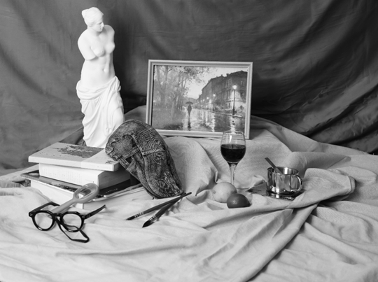 試題中選用的書本、水果、不銹鋼咖啡杯等不同形態(tài)的物體,其中既有自然形態(tài),又有設計形態(tài),能夠多層面考查學生運用色彩塑造形體的能力;試題中靜物有硬朗的石膏、挺括的牛仔帽、柔軟的襯布等,能夠很好地考查學生運用色彩工具對不同質感物體的深入刻畫與表現(xiàn)能力;《米洛斯的阿芙洛狄忒》雕像是古典美術的典型代表,有著近乎完美的形態(tài)比例,在不同版本的高中美術教材中均有出現(xiàn),可以考查學生對教材的熟悉程度和應有的藝術素養(yǎng),同時白色石膏像用色彩的方式來表現(xiàn),能有效考查學生色彩技法運用能力及畫面的藝術表現(xiàn)力;帶框風景畫放入畫面,在以靜物為主體的試題中加入了風景元素,使畫面的整體節(jié)奏、色彩產生了更豐富的變化,可以進一步考查學生對畫面的整體把控和組織能力。