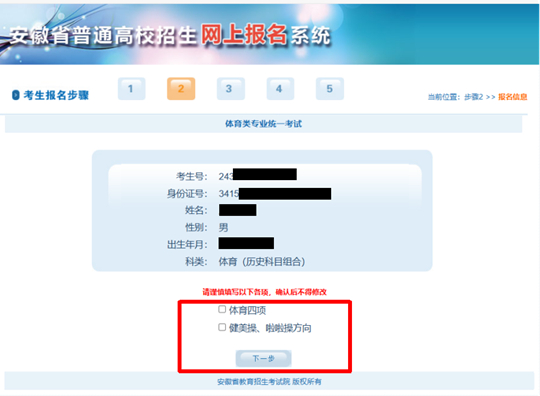 2.請(qǐng)核對(duì)自己的信息,確認(rèn)無誤后選擇報(bào)考“體育四項(xiàng)”或“健美操、啦啦操”,“體育四項(xiàng)”、“健美操、啦啦操”可以兼報(bào)。選擇了“健美操、啦啦操”的考生須明確具體方向,并與實(shí)際參加考試的項(xiàng)目保持一致。請(qǐng)認(rèn)真核對(duì),一旦確認(rèn),不得更改。