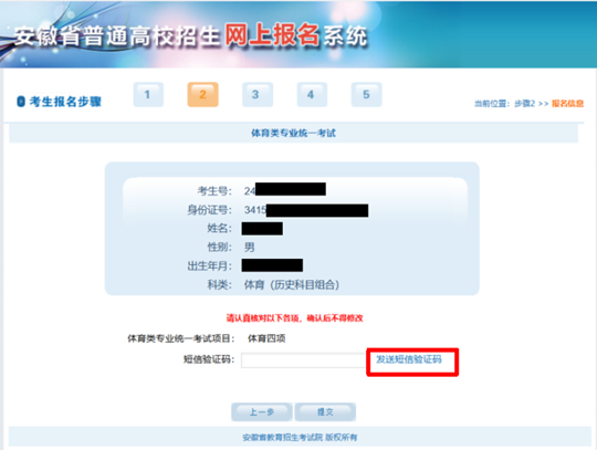 3.核對(duì)無誤后,點(diǎn)擊“下一步”再次核對(duì),并填入短信驗(yàn)證碼,點(diǎn)擊“提交”按鈕提交報(bào)名信息并進(jìn)入繳費(fèi)頁面。請(qǐng)勿頻繁發(fā)送短信驗(yàn)證碼。