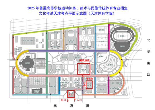 1.確認(rèn)好考試時(shí)間地點(diǎn)?忌鷦(wù)必要確認(rèn)好每門科目的考試時(shí)間與考點(diǎn)考場(chǎng)信息。考點(diǎn)入口為天津體育學(xué)院新校區(qū)東門,進(jìn)入校園后根據(jù)引導(dǎo)到達(dá)考場(chǎng)所在教學(xué)樓,考點(diǎn)位置詳見附圖。家長(zhǎng)及陪考人員不得進(jìn)入考點(diǎn)。上午考試結(jié)束后須離開考點(diǎn),請(qǐng)?zhí)崆白龊弥形缬貌鸵约靶菹⒌臏?zhǔn)備。