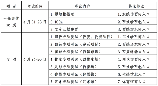 。ㄋ模y(cè)試采用分組輪換、集中測(cè)試的方式進(jìn)行,4月21-23日為一般身體素質(zhì)測(cè)試,4月24-25日為專項(xiàng)測(cè)試,考生具體考試時(shí)間以《專業(yè)準(zhǔn)考證》上公布為準(zhǔn)。