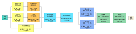 。1)藝術(shù)類本科批A段→(2)藝術(shù)類本科批B段→(3)兼報(bào)的普通類本科提前批C段→(4)兼報(bào)的普通類本科批→(5)藝術(shù)類高職(?疲┡6)兼報(bào)的普通類高職(?疲┨崆芭7)兼報(bào)的普通類高職(?疲┡