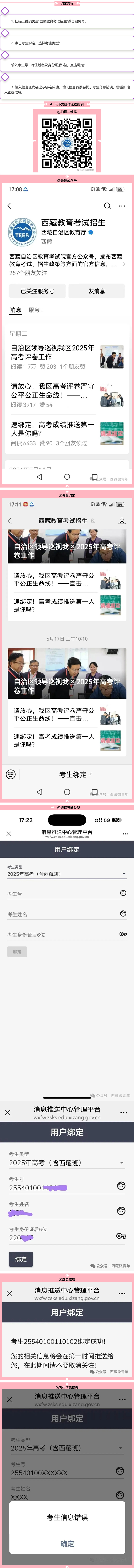 6月25日12時將發(fā)布我區(qū)2025年高考成績、各批次錄取最低控制分?jǐn)?shù)線和招生計劃。為確?忌皶r獲知自己的高考成績及后期的錄取結(jié)果,請考生掃描二維碼并關(guān)注“西藏教育考試招生”服務(wù)號,按照以下步驟選擇考試類別、填寫個人信息完成綁定,即可第一時間收到微信推送的考試成績與錄取信息。