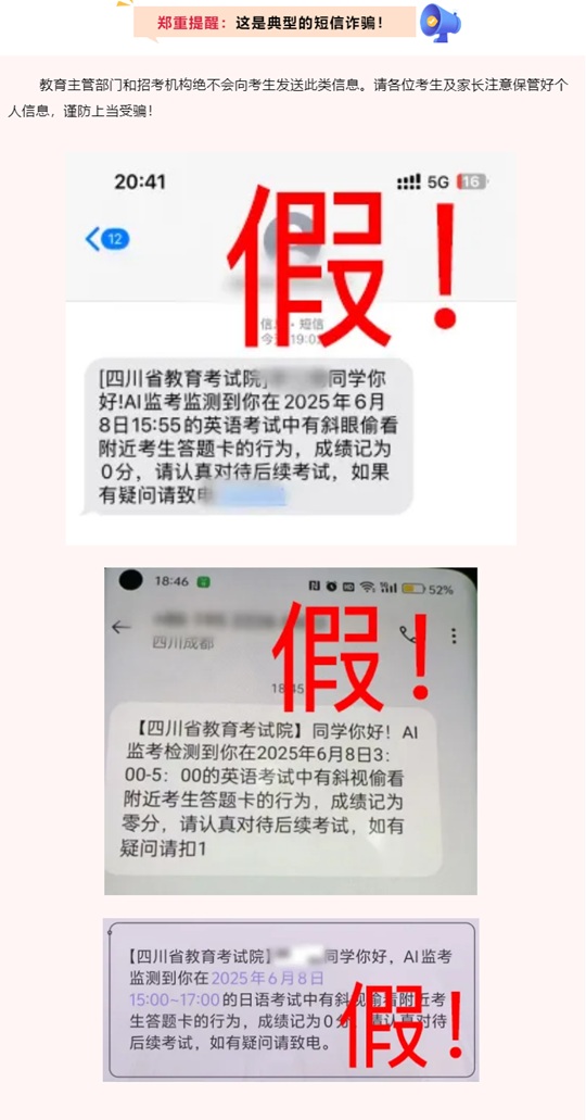 近日,部分高考考生收到所謂“四川省教育考試院”的短信,稱在考試中被AI監(jiān)考發(fā)現(xiàn)其有作弊行為,成績(jī)記為0分。
