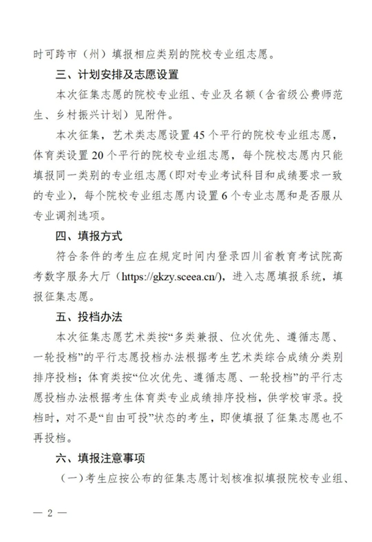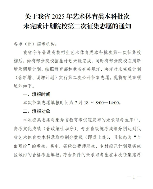關于四川省2025年藝術體育類本科批次未完成計劃院校第二次征集志愿的通知