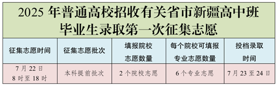 根據(jù)有關(guān)省市新疆高中班畢業(yè)生錄取工作日程安排,2025年普通高校招收有關(guān)省市新疆高中班畢業(yè)生錄取未完成計劃第一次征集志愿及投檔、錄取工作將于7月22日至24日進(jìn)行。