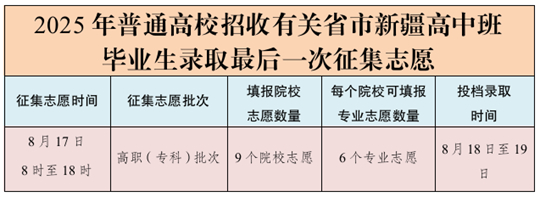 根據(jù)有關(guān)省市新疆高中班畢業(yè)生錄取工作日程安排,2025年普通高校招收有關(guān)省市新疆高中班畢業(yè)生錄取未完成計(jì)劃最后一次征集志愿及投檔錄取工作將于8月17日至19日進(jìn)行。