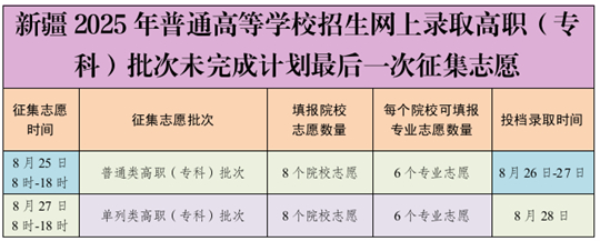 根據(jù)錄取日程安排,自治區(qū)2025年普通高等學(xué)校招生錄取高職(專(zhuān)科)批次未完成計(jì)劃最后一次征集志愿及投檔錄取工作將于8月25日至28日進(jìn)行。