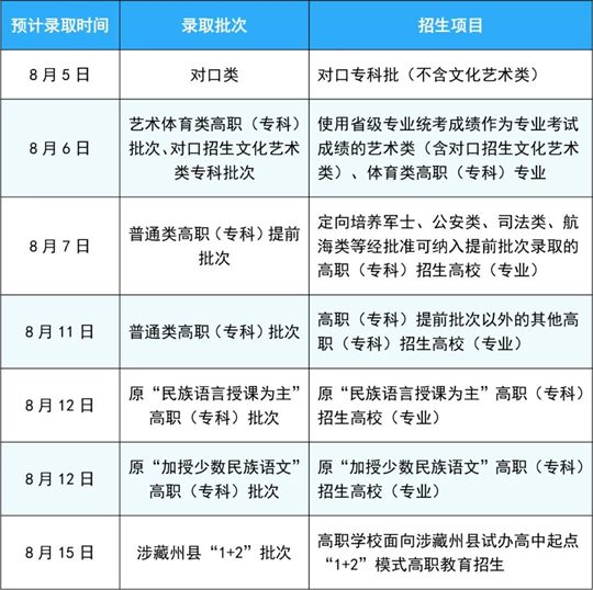 8月,高考錄取進(jìn)入普通類(lèi)、藝術(shù)類(lèi)、體育類(lèi)等多個(gè)招生類(lèi)型的高職(專(zhuān)科)批次,各批次預(yù)計(jì)錄取時(shí)間詳見(jiàn)下表。