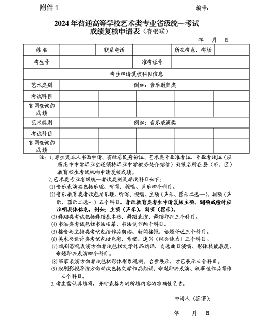 附件:1.2024年普通高等學(xué)校藝術(shù)類專業(yè)省級統(tǒng)一考試成績復(fù)核申請表