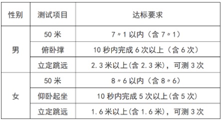 三、體能測(cè)試項(xiàng)目及合格標(biāo)準(zhǔn)