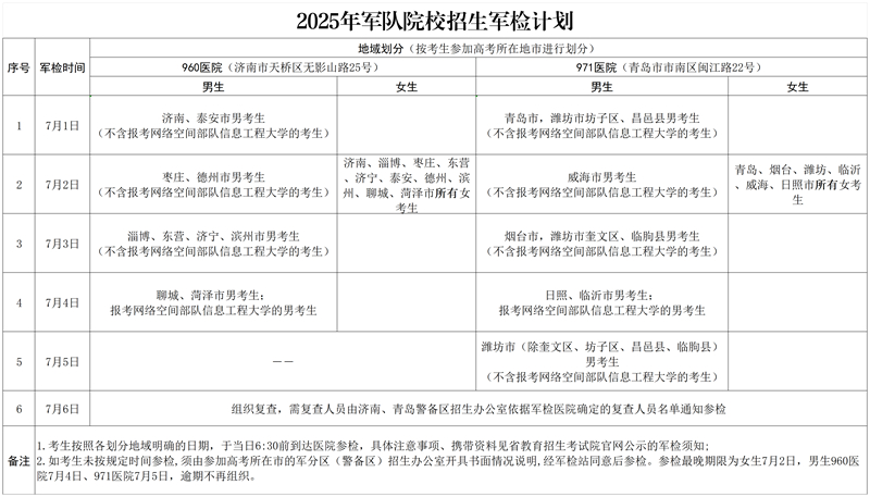 山東省2025年軍隊(duì)院校招生軍檢計(jì)劃