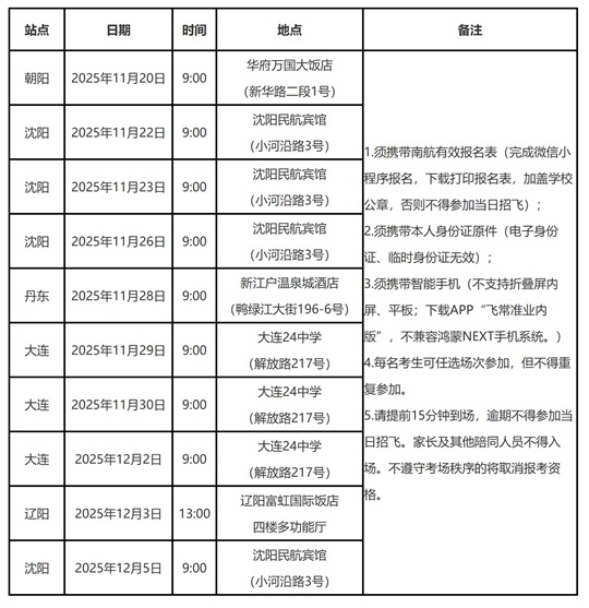 注:1.整體選拔安排說明:招飛相關環(huán)節(jié)安排綜合測試,包括但不限于飛行職業(yè)能力傾向測試、英語測試、綜合面試等考核,通過人員方可進入后續(xù)環(huán)節(jié),具體安排以當地南航招飛辦通知為準。