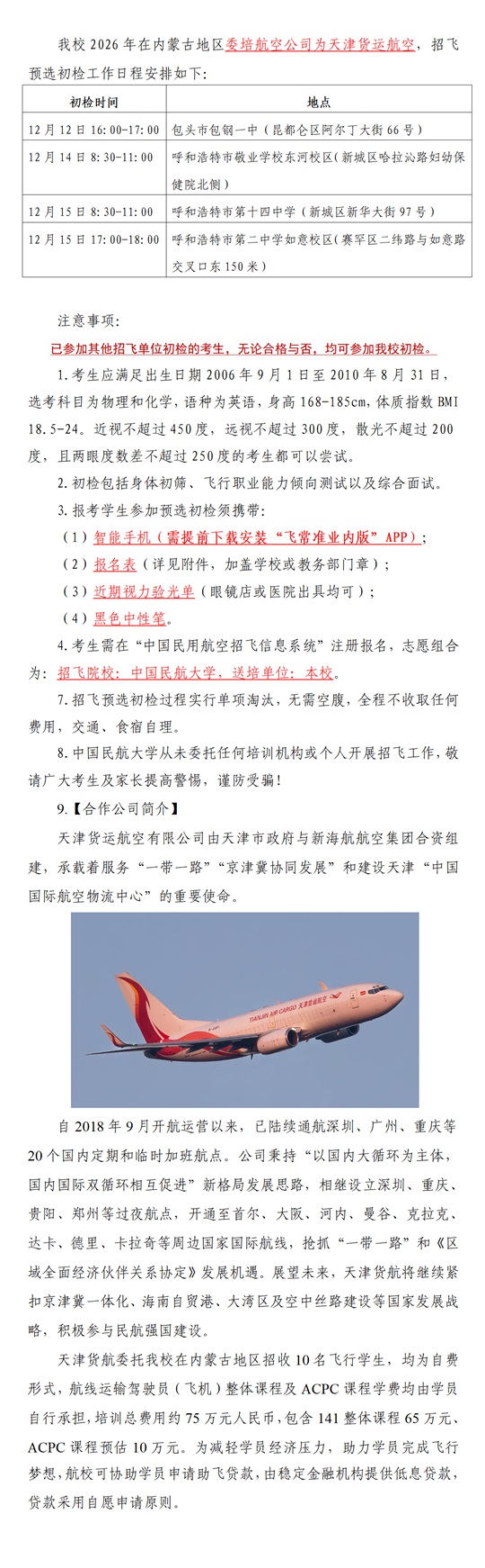 中國民航大學(xué)內(nèi)蒙古地區(qū)2026年招飛預(yù)選初檢日程安排