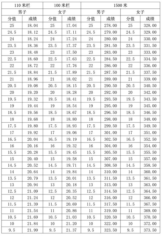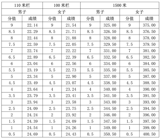 2.男子110米欄、女子100米欄、1500米跑評分表(單位:秒)