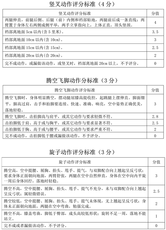 3.體操專項總分按40分計算,其中專項素質(zhì)占12分,規(guī)定動作占28分,自選動作不計分?忌鷮m椝刭|(zhì)和規(guī)定動作得分的總和即為體操專項總分。