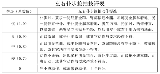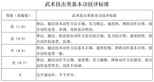 a.姿勢正確,方法清楚;身體協(xié)調(diào),勁力順達(dá),力點準(zhǔn)確;精神貫注,節(jié)奏分明;內(nèi)容充實,風(fēng)格突出者,不扣分。b.與要求輕微不符者,扣0.1-1分,c.與要求顯著不符者,扣1.1-2分,d.與要求嚴(yán)重不符者,扣2.1-3分,e.完不成動作中途退場者,不于評分。f.完成套路的時間不足40秒(太極拳不足1分30秒),每少0.1秒至2秒扣0.1分,每少2.1秒至4秒扣0.2分,依此類推。