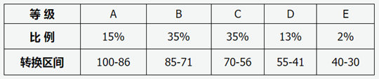 第二步,將A至E五個(gè)等級(jí)內(nèi)的考生原始分,按照等比例轉(zhuǎn)換規(guī)則,轉(zhuǎn)換到100——86,85——71,70——56,55——41和40——30五個(gè)分?jǐn)?shù)區(qū)間,根據(jù)轉(zhuǎn)換公式計(jì)算,四舍五入取整數(shù)得到考生的等級(jí)轉(zhuǎn)換分。轉(zhuǎn)換后的成績(jī)一分一檔,考生排序不變。