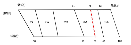 第一步,將該科目考生卷面原始分從高到低依次按照15%、35%、35%、13%和2%的比例劃分為A、B、C、D、E共5個(gè)等級(jí),考生的原始分轉(zhuǎn)換成等級(jí)。缺考、零分考生人數(shù)不計(jì)入轉(zhuǎn)換基數(shù),違紀(jì)或作弊考生計(jì)入轉(zhuǎn)換基數(shù),但轉(zhuǎn)換后的成績(jī)按零分計(jì)。