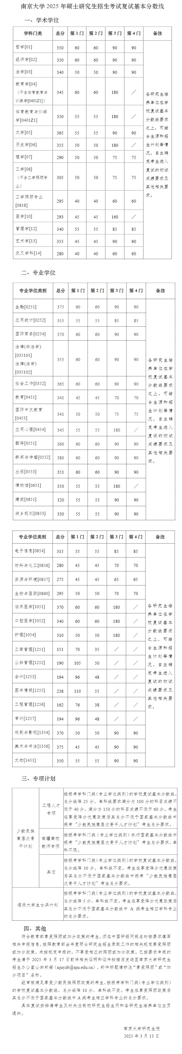 南京大學(xué)2025年碩士研究生招生考試復(fù)試基本分?jǐn)?shù)線