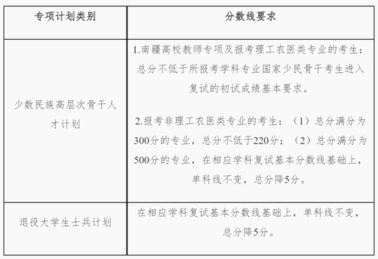 3.我校少數(shù)民族照顧政策按照教育部《2025年全國碩士研究生招生工作管理規(guī)定》執(zhí)行。工作單位在國務(wù)院公布的民族區(qū)域自治地方,且定向就業(yè)原單位的少數(shù)民族在職人員考生,申請享受照顧政策的,須在網(wǎng)上報名時按要求填報相關(guān)信息。未按規(guī)定申報或?qū)徍宋赐ㄟ^的,不享受照顧政策。學(xué)校將根據(jù)考生材料和有關(guān)部門反饋的名單進(jìn)行審核。審核通過者可在相應(yīng)普通計劃學(xué)科分?jǐn)?shù)線基礎(chǔ)上總分降5分或一門單科降5分,考生在享受照顧政策后,分?jǐn)?shù)不得低于享受少數(shù)民族照顧政策國家線有關(guān)要求。