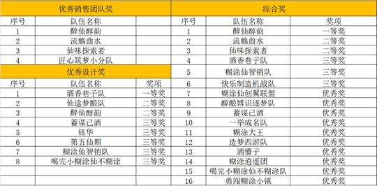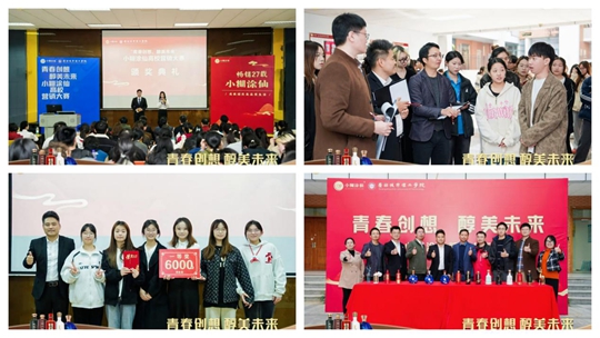 本次大賽自啟動以來,受到了全校師生的廣泛關(guān)注和參與。自10月31日開幕至今,共有59支隊伍300余名同學(xué)報名參賽。決賽評審現(xiàn)場,學(xué)校老師與小糊涂仙酒業(yè)集團(tuán)代表共同組成的專業(yè)的評審團(tuán)來到各團(tuán)隊展位,聽取各參賽隊伍的匯報講解,并圍繞策劃方案、推廣銷售額、實物/電子作品設(shè)計等進(jìn)行綜合評審打分,最終評選出優(yōu)秀銷售團(tuán)隊獎、優(yōu)秀設(shè)計獎、綜合獎,共28個獎項。