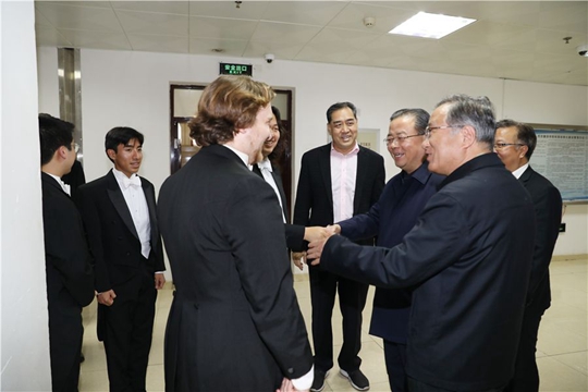 陜西省委教育工委副書記王海波,西譯執(zhí)行董事、校長崔智林與合唱團交流