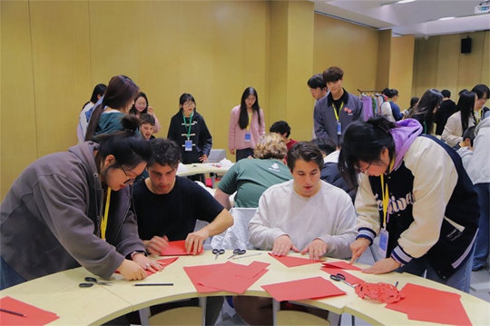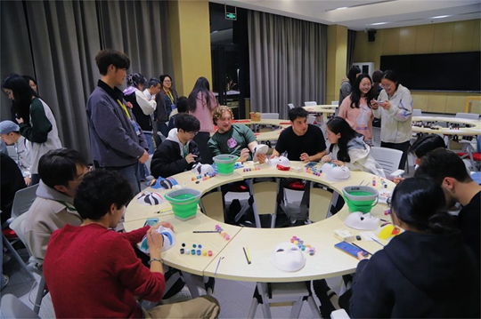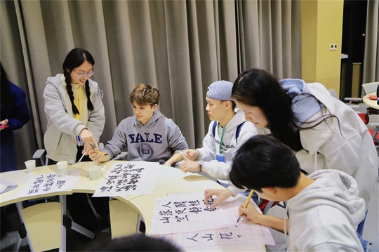在副校長郭煒的陪同下,合唱團一行先后來到西譯的風(fēng)雨操場與5號實訓(xùn)樓等教學(xué)場所參觀。過程中,他們感受著西譯獨具特色的建筑風(fēng)格,傾聽著陪同人員關(guān)于學(xué)校創(chuàng)立、發(fā)展歷程及辦學(xué)理念的介紹,對西安翻譯學(xué)院濃郁的人文氣息、智能的教學(xué)設(shè)施、多元的辦學(xué)特色連連稱贊。合唱團成員紛紛表示,中國很美,中國朋友對我們很友好,尤其是在高校,大家對我們都很熱情……西區(qū)語言體驗中心的文化館里不時傳來陣陣歡呼聲和驚嘆聲,畫臉譜、寫書法、剪紙畫、做印章等中國傳統(tǒng)文化展示和體驗,是此次交流的重點內(nèi)容,耶魯大學(xué)的同學(xué)對中國博大精深的文化贊不絕口,絢麗的臉譜深深吸引著耶魯大學(xué)合唱團學(xué)子,他們仔細(xì)詢問原材料、制作工藝、制作技巧,還主動拿起畫筆體驗勾勒京劇臉譜;同時,他們對書法和投壺也產(chǎn)生了濃厚的興趣,不時舉起手機記錄下精彩時刻。