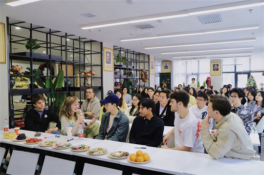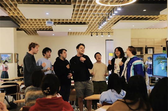 次日,合唱團成員與西安翻譯學(xué)院語言類相關(guān)專業(yè)的學(xué)生開展文化交流活動。交流會上,中外學(xué)子零距離對話,大家對相互感興趣的流行文化、人文地理、校園生活和音樂等話題進行深入交流。西安翻譯學(xué)院學(xué)生分別帶來中、外文歌曲以及太極拳、書法、古琴等民族樂器的展示;來自合唱團的同學(xué)們也被邀請即興表演無伴奏合唱,現(xiàn)場互動氣氛熱烈。交流中,耶魯大學(xué)學(xué)生合唱團的成員Ian激動地表示:“我感受到這里的同學(xué)們很熱情,我很喜歡你們用多才多藝的表演方式來歡迎我們,這讓我們彼此互相了解得更多。我們此次的巡演最特別之處,就是在這里結(jié)識到很多興趣相投、年齡相仿的朋友!狈g專業(yè)學(xué)生茍家成開心地說道:“感謝學(xué)校為我們搭建這次交流平臺,合唱團的同學(xué)們表演的無伴奏多聲部合唱帶給我們最純粹的美好,極具感染力,無論是指揮還是演唱都洋溢著熱情與活力。剛才我也表演了節(jié)目,我表演的時候他們都在認(rèn)真觀看,他們表演的時候我也在認(rèn)真欣賞,這是一個非常難忘的音樂交流互動體驗!蓖ㄟ^雙方學(xué)生的交流互動,進一步開闊了西譯學(xué)子的國際化視野,增進雙方學(xué)生的相互了解,同時,也提升了西譯師生的國際化意識,豐富了學(xué)校的國際化氛圍。