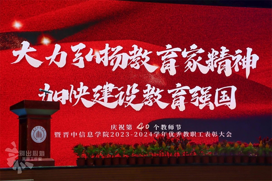 為弘揚教育家精神,展現(xiàn)教師隊伍的昂揚風采,激勵廣大教職工積極投身到學校辦學育人實踐中,推動學校高質量發(fā)展,在第40個教師節(jié)來臨之際,晉中信息學院于9月6日14:30在烏馬河劇院隆重舉行“大力弘揚教育家精神加快建設教育強國”晉中信息學院2023-2024學年優(yōu)秀教職工表彰大會,表彰過去一學年中在教書育人、管理創(chuàng)新及服務保障等各個領域內展現(xiàn)卓越風采、作出杰出貢獻的優(yōu)秀教師與教育工作者們。學校全體在校領導、全體中層干部、榮獲表彰的杰出教職工、新聘教職工及各單位教工代表出席大會。表彰大會由常務副校長劉正國主持。