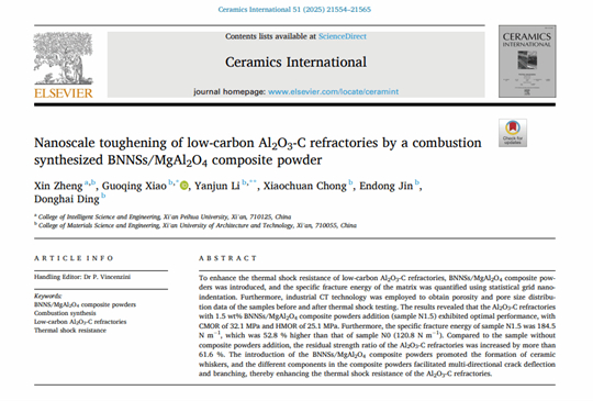 近日,西安培華學(xué)院智能科學(xué)與工程學(xué)院鄭欣博士團(tuán)隊在國際材料領(lǐng)域SCIE期刊《Ceramics International》發(fā)表題為《Nanoscale toughening of low-carbon Al₂O₃-C refractories by a combustion synthesized BNNSs/MgAl₂O₄ composite powder》的學(xué)術(shù)論文。該期刊創(chuàng)刊于1971年,由Elsevier Ltd出版,在中國科學(xué)院分區(qū)中屬材料科學(xué)大類2區(qū),為材料科學(xué)權(quán)威Top期刊,影響因子5.6,是國際公認(rèn)的材料科學(xué)權(quán)威刊物之一。