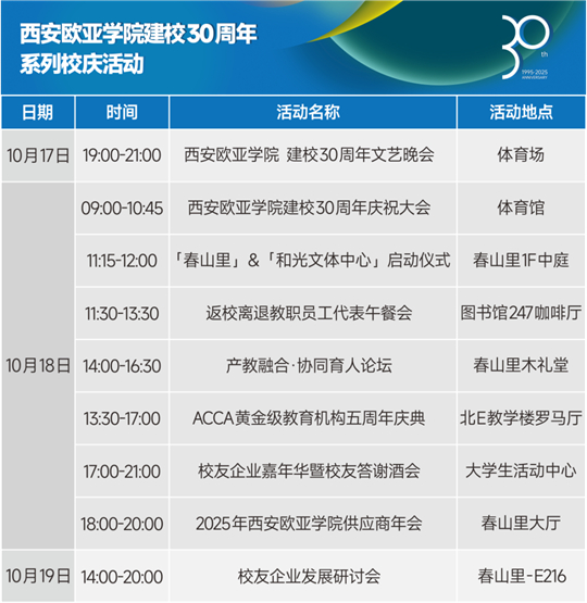 此外,西安歐亞學(xué)院建校30周年文藝晚會將率先點(diǎn)亮校慶的第一束光;返校離退教職員工代表午餐會向躬耕教育的教師致敬;供應(yīng)商年會則彰顯與合作伙伴攜手共進(jìn)、構(gòu)建良性生態(tài)的誠意。