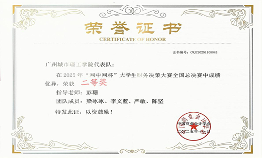 11月8日,第十三屆“網(wǎng)中網(wǎng)杯”全國大學(xué)生財務(wù)決策大賽全國總決賽落下帷幕。廣州城市理工學(xué)院國際商學(xué)院教師彭珊指導(dǎo)的學(xué)生團隊表現(xiàn)亮眼,從全國眾多參賽隊伍中脫穎而出,最終斬獲全國總決賽二等獎,充分展現(xiàn)了學(xué)子的過硬專業(yè)素養(yǎng)與實踐能力。
