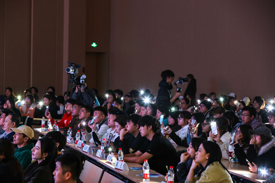 隨后的 AI 現(xiàn)場共創(chuàng) MV 環(huán)節(jié),將活動氛圍推向高潮。此前,師生們在祝福墻上寫下對專業(yè)、對創(chuàng)作的寄語,廣編專業(yè)師生即刻聯(lián)動AI,將這些真摯祝福轉(zhuǎn)化為一首專屬 MV歌曲《寫給未來的光》。當(dāng)旋律響起,全場同學(xué)默契打開手機(jī)閃光燈,點(diǎn)點(diǎn)光亮如星海般搖曳,溫暖氛圍包裹整個(gè)會場。