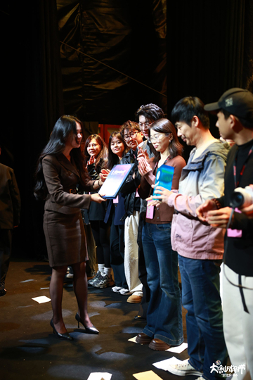 演出圓滿落幕之際,鋰洋主任代表《筆尖·心跳》劇組,滿懷誠摯地向大涼山國際戲劇節(jié)組委會以及所有到場觀眾致以最深切的謝意。他借邛海天空中的云這一充滿詩意與希望的意象,抒發(fā)感慨:只要有云,天空就會美麗;只要有戲,世界就更美好美好。大涼山戲劇節(jié)組委會代表趙建雪上臺,將象征榮譽(yù)的名牌與證書授予《筆尖·心跳》劇組,現(xiàn)場掌聲雷動,將這份榮耀與喜悅推向高潮。
