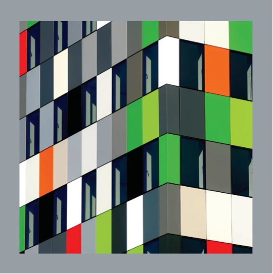走近春山里,極具雕塑感的建筑形態(tài)引人注目,灰白色系墻面構(gòu)成沉穩(wěn)背景,跳躍的開窗尺度與色彩點綴其間,面向主校園的東立面,變化豐富的陽臺造型令人聯(lián)想到蒙德里安的構(gòu)成藝術(shù)