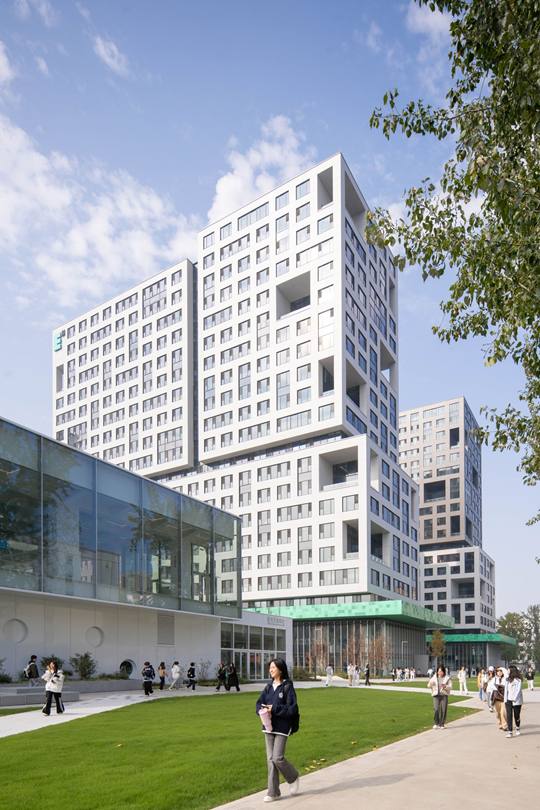 因此,團隊確立了高層集約型的設計方向,從根本上避免土地資源的浪費。方案最終確定為兩棟公寓樓及兩層裙房。建筑高度達72米,地上20層,地下2層,集中提供888套學生公寓,可容納3000余名學生。這一高度集約化的布局,將學生的“衣食住行”高效整合于有限的土地之上,同時也使其成為校園西區(qū)的顯著地標,與東區(qū)建筑群形成視覺呼應,重塑了校園的空間結(jié)構(gòu)。