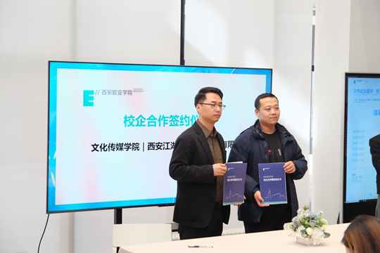隨后,在校企合作簽約環(huán)節(jié)中,文化傳媒學(xué)院院長助理雷方超和院長助理陳哲代表分院,與西安江湖映畫動漫文化有限公司、西安九五天成文化傳播有限公司、陜西樂頌文化傳媒有限公司、陜西翰林文化發(fā)展有限公司、陜西商脈傳媒有限公司、北京聰明核桃教育科技有限公司、曠世傳聲傳媒科技集團(tuán)共7家企業(yè)簽署合作協(xié)議。